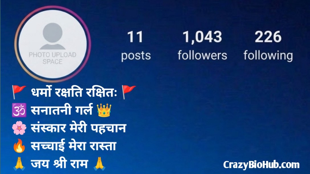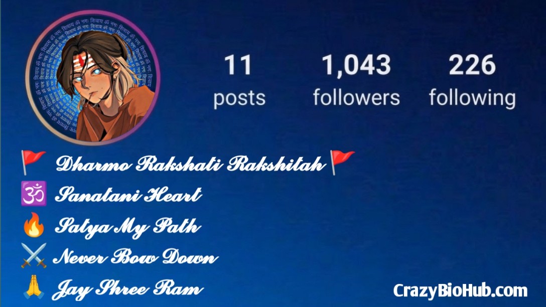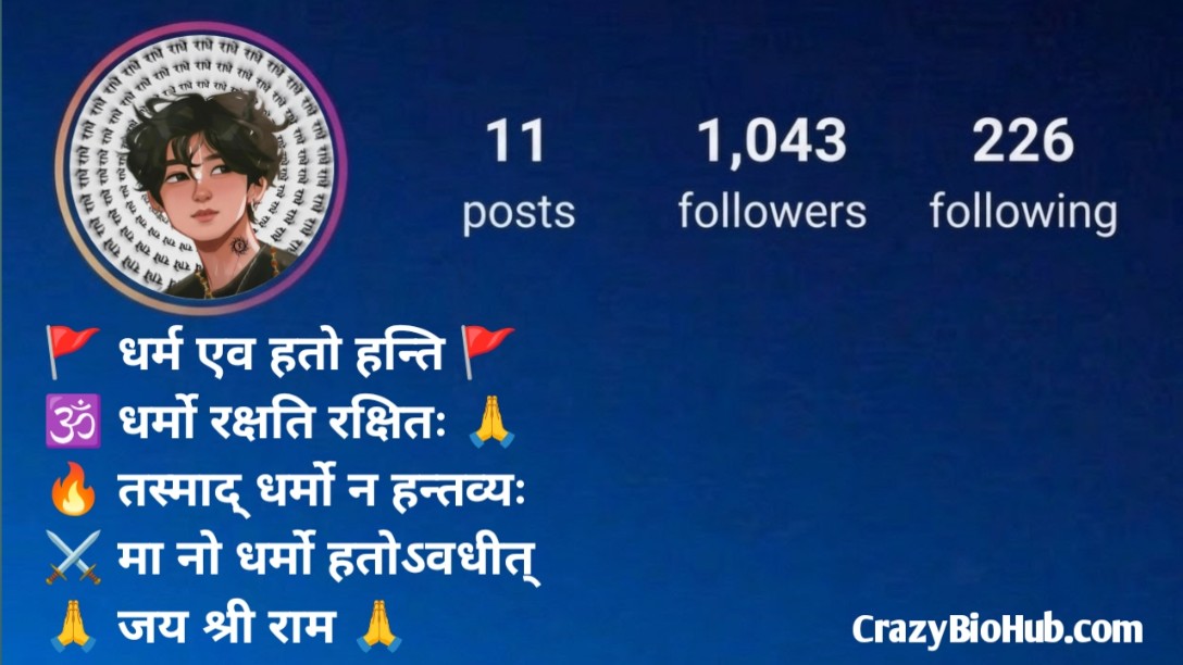 हमारी शानदार Dharmic Bio For Instagram की लिस्ट को जरूर देखें, जो आपके प्रोफाइल को positive, spiritual और meaningful बना देगी ✨ इसमें आपको मिलेंगे Dharmic Bio in Hindi, Sanskrit Bio, Short Spiritual Bio, Karma Bio, Truth & Life Bio और Motivational Dharm Bio जैसे जबरदस्त ऑप्शन। अपने विचारों और style के हिसाब से एक bio चुनें और अपने प्रोफाइल को एक unique, powerful और inspiring level पर ले जाएं 😇