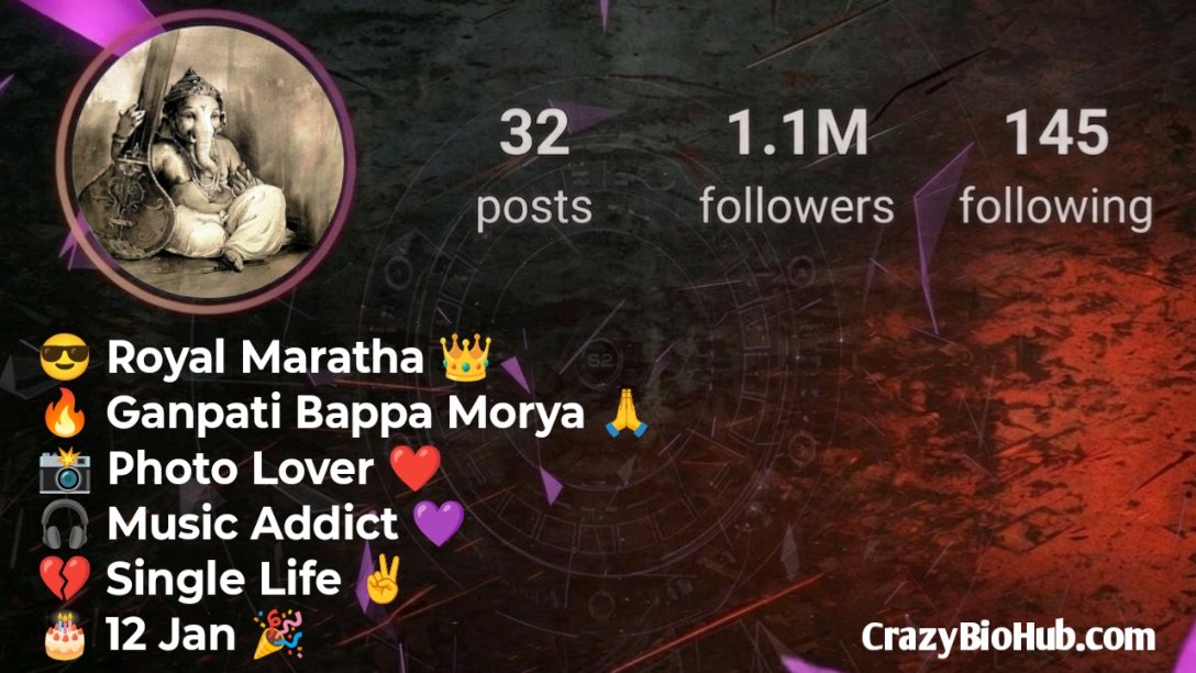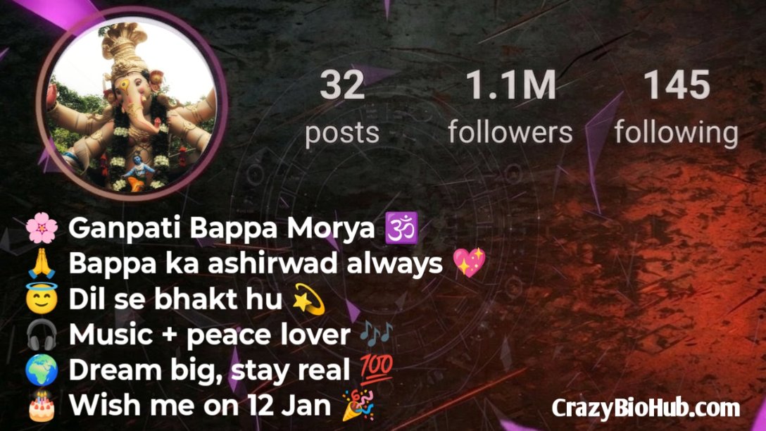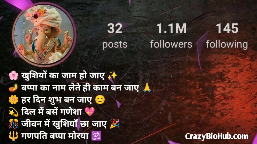 अगर आप अपने Instagram प्रोफाइल को और भी आकर्षक और धार्मिक बनाना चाहते हैं, तो ये बायो आपके लिए बिल्कुल परफेक्ट हैं। ये बायो आपकी भक्ति, विश्वास और गणपति बप्पा के प्रति प्रेम को खूबसूरती से दर्शाते हैं ।